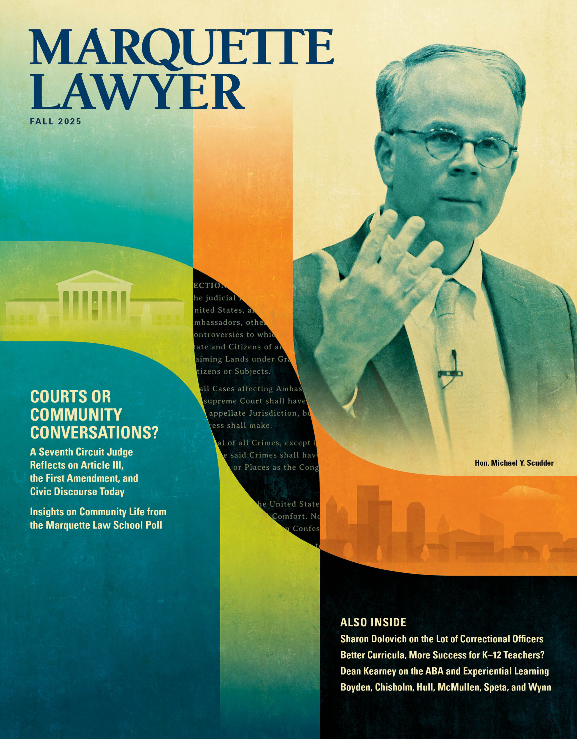 The cover story of the magazine, headlined “Courts or Community Conversations?,” sets the theme. In his E. Harold Hallows Lecture at Marquette Law School on March 3, 2025, the Hon. Michael Y. Scudder, a judge of the United States Court of Appeals for the Seventh Circuit, discussed some of the constitutional limits on bringing issues before federal courts. He expanded on this by suggesting that constitutional limits on jurisdiction protect First Amendment interests and the value of democratic self-government, ensuring that state institutions such as city councils and school boards remain at the center of debate and decision.