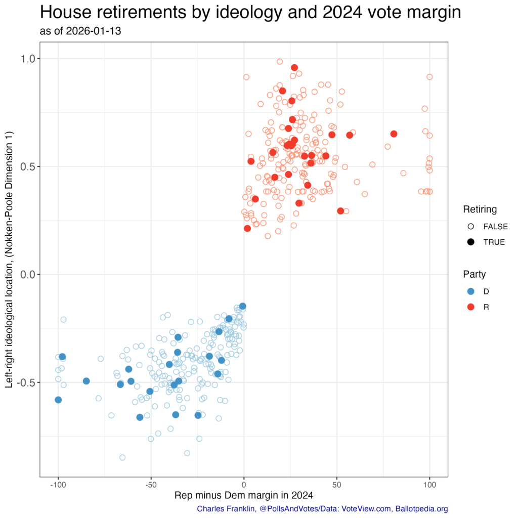 The main point I want to make here is that the retirements are spread pretty widely throughout both Republican and Democratic caucuses by ideology and 2024 vote margin. The solid dots are retiring members. These are not endangered incumbents who barely scraped by in 2024, nor are they ideological outliers relative to their caucuses.
