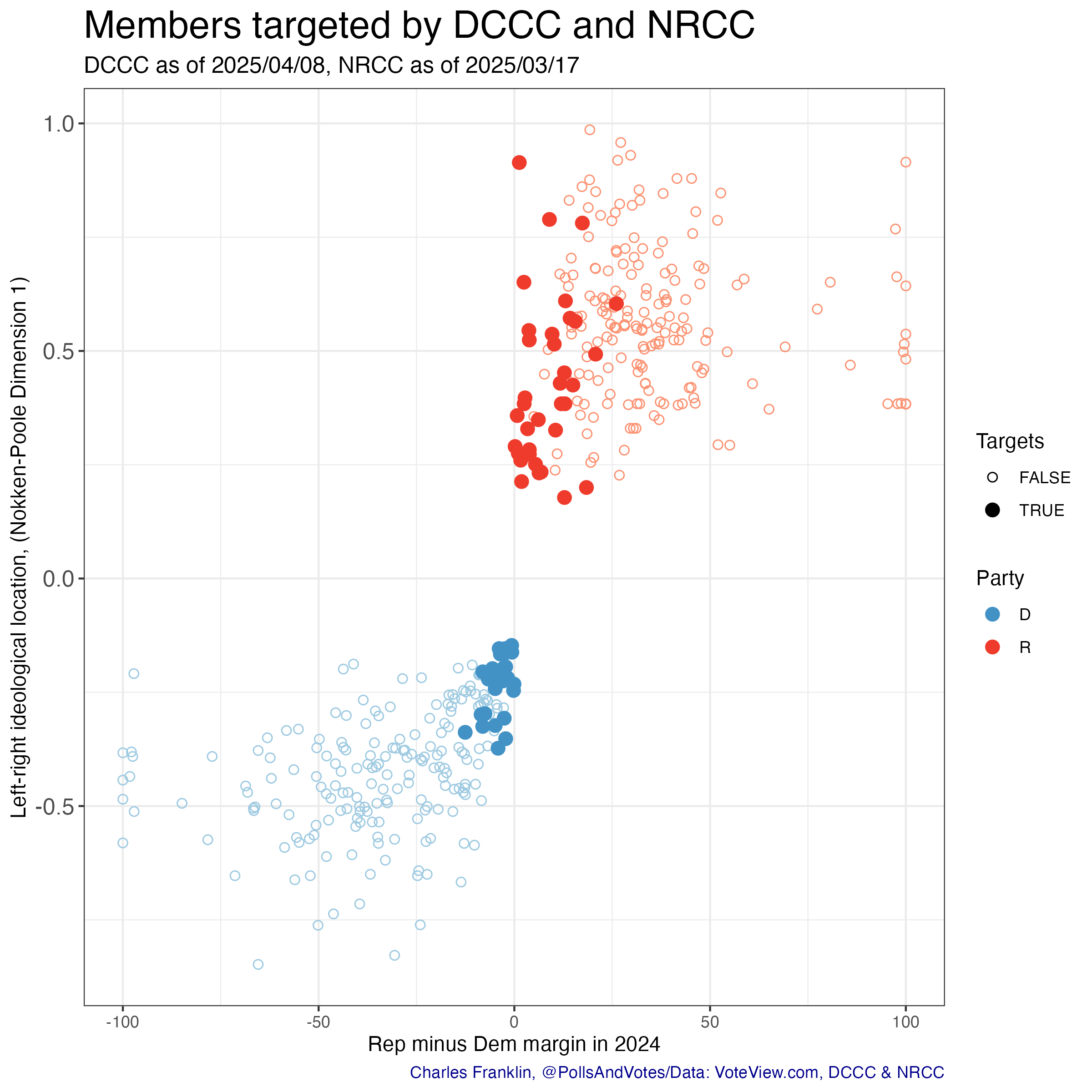 Both the Democratic Congressional Campaign Committe (DCCC) and the National Republican Congressional Committee (NRCC) have released lists of districts being targeted as pick up opportunities. Compare this figure with the retirements above. The targeted districts are, as you would expect, far more concentrated in races that were narrowly decided in 2024. (These lists were released by the NRCC on March 17, and by the DCCC on April 8. They do not include changes or additions after some states redistricted in 2025. These are the members’ districts in the 119th congress.)