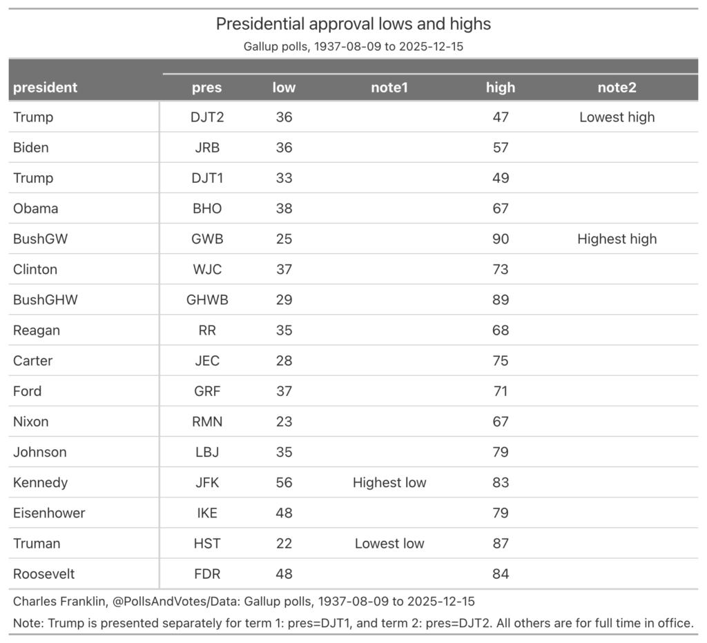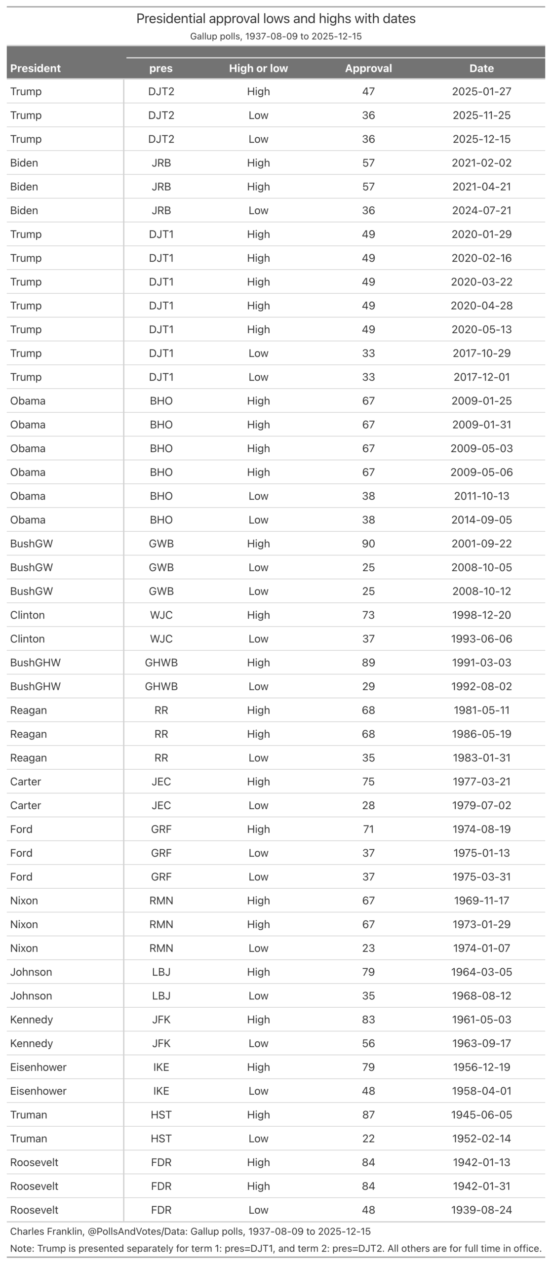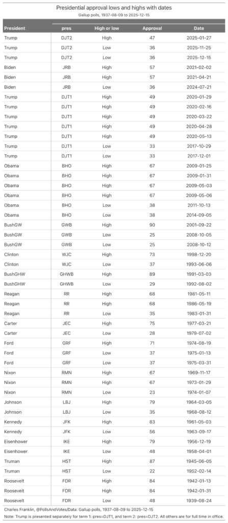 Presidents can tie their highs or lows in multiple polls on different days. The next table shows all the lows and highs and the dates on which those polls were taken. Some of the dates are instructive. Trump’s second term high came 7 days after his inauguration. And his first term highs were all during the early months of the Covid pandemic. Biden’s low came about the time he dropped out of the presidential race in 2024. For George W. Bush and Franklin D. Roosevelt, their highest marks came after attacks on the United States, after Sept. 11, 2001 and after Dec. 7, 1941.
